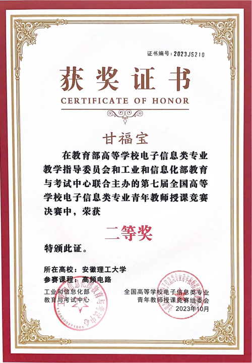 全国高等学校电子信息类专业青年教师授课竞赛由教育部高等学校电子信息类专业教学指导委员会和工业和信息化部教育与考试中心联合举办,是中国高等教育学会认可的50项全国性高校教师教学竞赛之一。本届大赛于2023年4月启动,预赛分华东、华西、华南和华北四个赛区,共25个省、直辖市、自治区190所高校700多名选手参赛。肉动漫 甘福宝、郝娟、赵凤美、张晓明四位老师代表学院参加了华东赛区的初赛,其中赵凤美、张晓明获得初赛三等奖,郝娟获初赛二等奖,甘福宝以华东赛区初赛一等奖的好成绩挺进了决赛。
