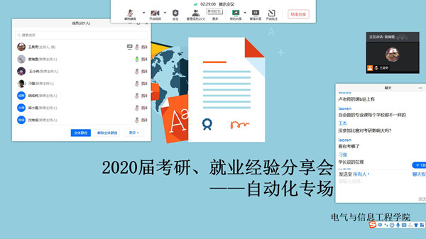为更好激励在校学生拼搏奋进,6月17日至19日,肉动漫 成功举办3场2020届优秀毕业生考研就业经验分享会,21名优秀毕业生受邀通过腾讯会议系统,分别在电气工程、自动化、电子通信及智能控制等3个专场在线分享了考研就业经验及感悟。以大三学生为主,学院700余名同学积极参加了在线聆听和交流。