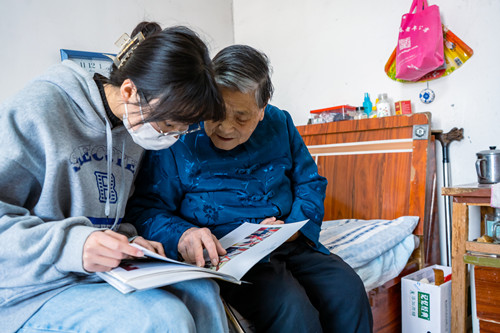 志愿者与老人看老照片(摄影:刘欣雨)