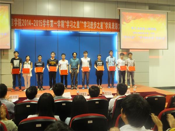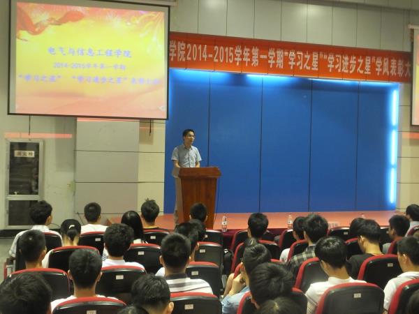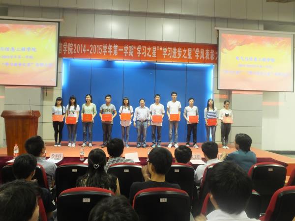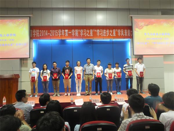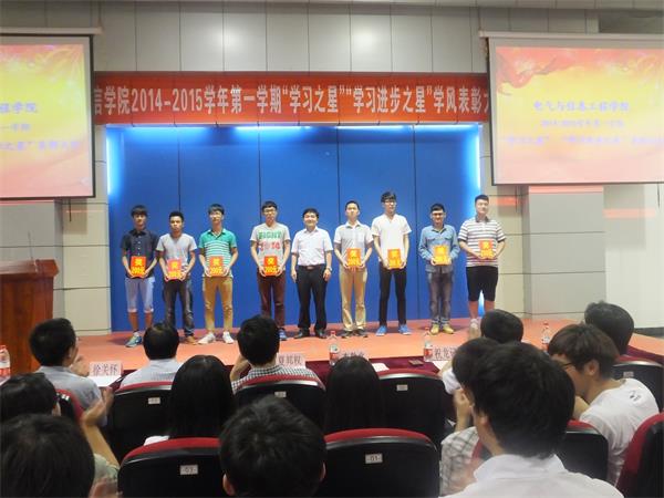 学院党委副书记徐关怀宣读表彰决定。表彰电子信息工程2013-2班等8个优秀学风班级,15#217寝室等33个优秀学风宿舍,吴涛等61名学习之星,项成等32名学习进步之星。