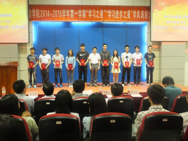 5月26日晚,学院2014-2015学年第一学期“学习之星”、“学习进步之星”表彰大会在北校区图书馆二楼报告厅隆重召开。学院领导李敬兆、夏邦权、祝龙记、虞尚元、欧阳名三出席表彰大会并为获奖先进集体和个人颁奖。学院各年级辅导员,受表彰的同学以及2014级全体学生参加表彰会。表彰会由学院团委副书记赵埕萱主持。