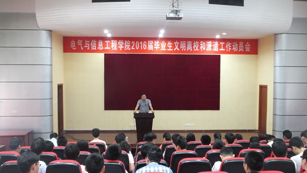 本次毕业生动员会是电信学院文明离校系列活动之一。电信学院高度重视2016届学生文明离校教育和派遣工作,专门成立了以学院主要负责人为组长,由学院副书记、副院长以及毕业班辅导员等组成的领导组,围绕“平安、有序、文明、和谐”主题,自5月底以来,在做好学校统一部署的“开展好七项教育、抓好六项活动”的基础上,重点实施21项文明离校教育系列活动,倒排时间表、由专人负责落实,着力把毕业生派遣工作落实、落细、落小。