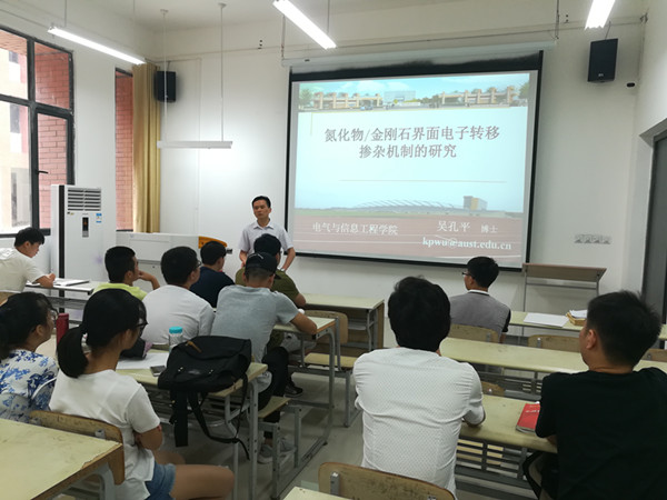 吴孔平汇报了在日本访学一年里的工作和生活情况,介绍了在日本国立物质材料科学研究所(NIMS)开展第三代半导体材料与器件研究的过程和取得成绩,汇报了访学一年的体会,并作了题为《氮化物/金刚石界面电子转移掺杂机制的研究》专题报告,详细介绍了利用界面电子转移解决掺杂的方法。
