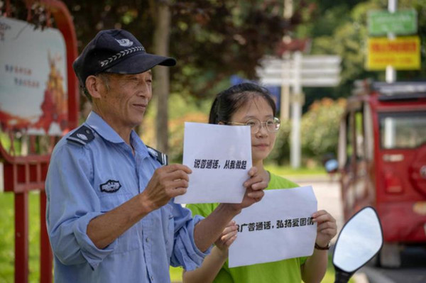 志愿者们头顶炎炎烈日、脚踏崎岖道路,以饱满热情在红色景区、青少年活动中心、中小学等地集中开展宣传推广普通话的系列活动。