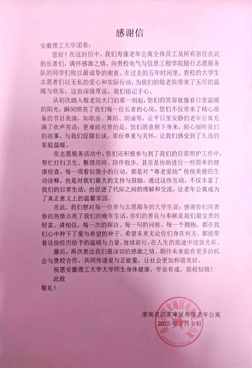 近日,一封满载感激之情的感谢信悄然送达肉动漫 ,这封信来自淮南市寿康老年公寓,深情地表达了敬老院全体成员对肉动漫 励行志愿服务队由衷感谢与高度认可。