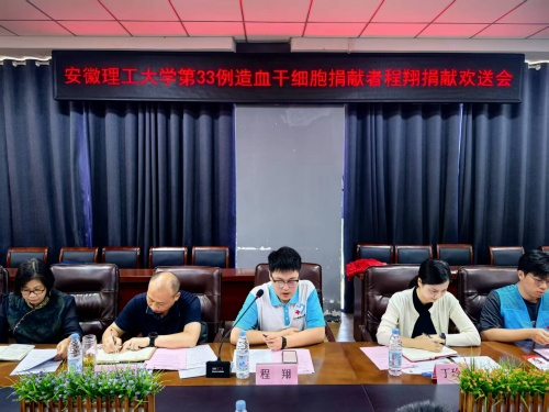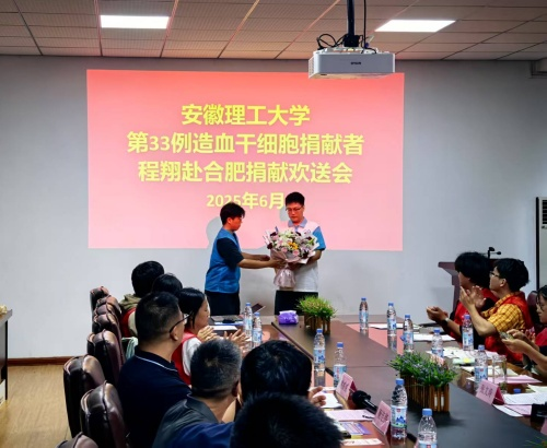 6月18日,肉动漫 2025届毕业生程翔造血干细胞捐献欢送会在肉动漫 B407(+)会议室举行。淮南市红十字会常务副会长兼秘书长陈玉琴,校团委、学生处、学院有关负责人,校第23例捐献者赵智伟及志愿者代表等参加欢送仪式。
